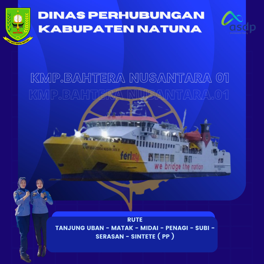 Salah satu sarana transportasi laut yang menghubungkan penyeberangan antar pulau di wilayah Provinsi Kepulauan Riau dan Provinsi Kalimantan Barat. KMP BAHTERA NUSANTARA 01 yang di kelola oleh BPTD Kelas II Kepri, kapal yang berjenis RO RO dengan panjang 72 mtr dan lebar 14 mtr tersebut melayani rute: